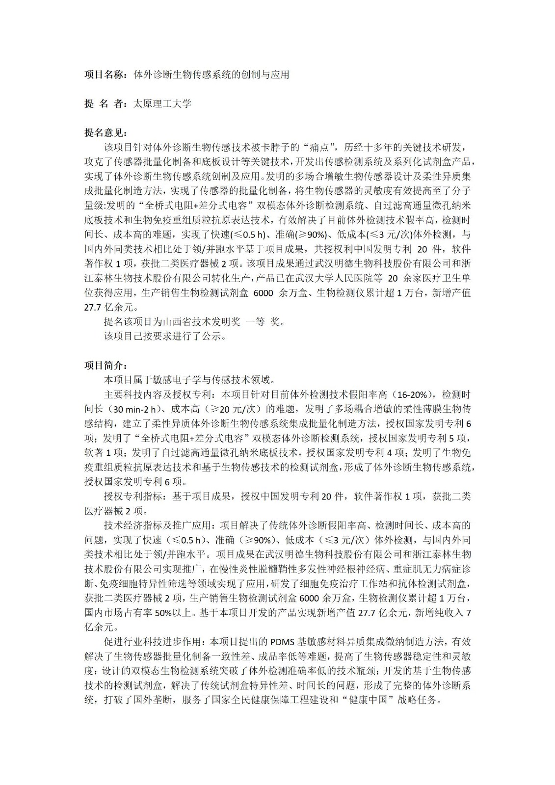 根據(jù)山西省科學(xué)技術(shù)廳關(guān)于山西省技術(shù)發(fā)明獎提名工作的相關(guān)規(guī)定,浙江泰林生物技術(shù)股份有限公司、太原理工大學(xué)、武漢明德生物科技股份有限公司合作研發(fā)的科技成果“體外診斷生物傳感系統(tǒng)的創(chuàng)制與應(yīng)用”擬提名2024年度山西省技術(shù)發(fā)明獎一等獎,現(xiàn)予以公示。公示期2024年12月09日至2024年12月15日。